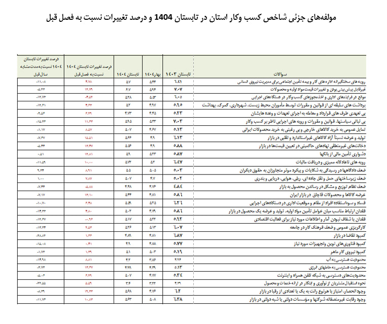 به گفته سبزواری، در سطح ملی نیز شاخص کل محیط کسب‌وکار کشور در تابستان ۱۴۰۴ عدد ۶.۰۹ را ثبت کرده که نسبت به فصل پیش از آن (بهار ۱۴۰۴) ۲.۴۲ درصد کاهش و نسبت به فصل مشابه سال قبل (تابستان ۱۴۰۳) نیز ۱.۱۷ درصد افت را نشان می‌دهد. این تغییرات بیانگر تداوم شرایط نسبتاً نامساعدتر در فضای عمومی کسب‌وکار کشور است.