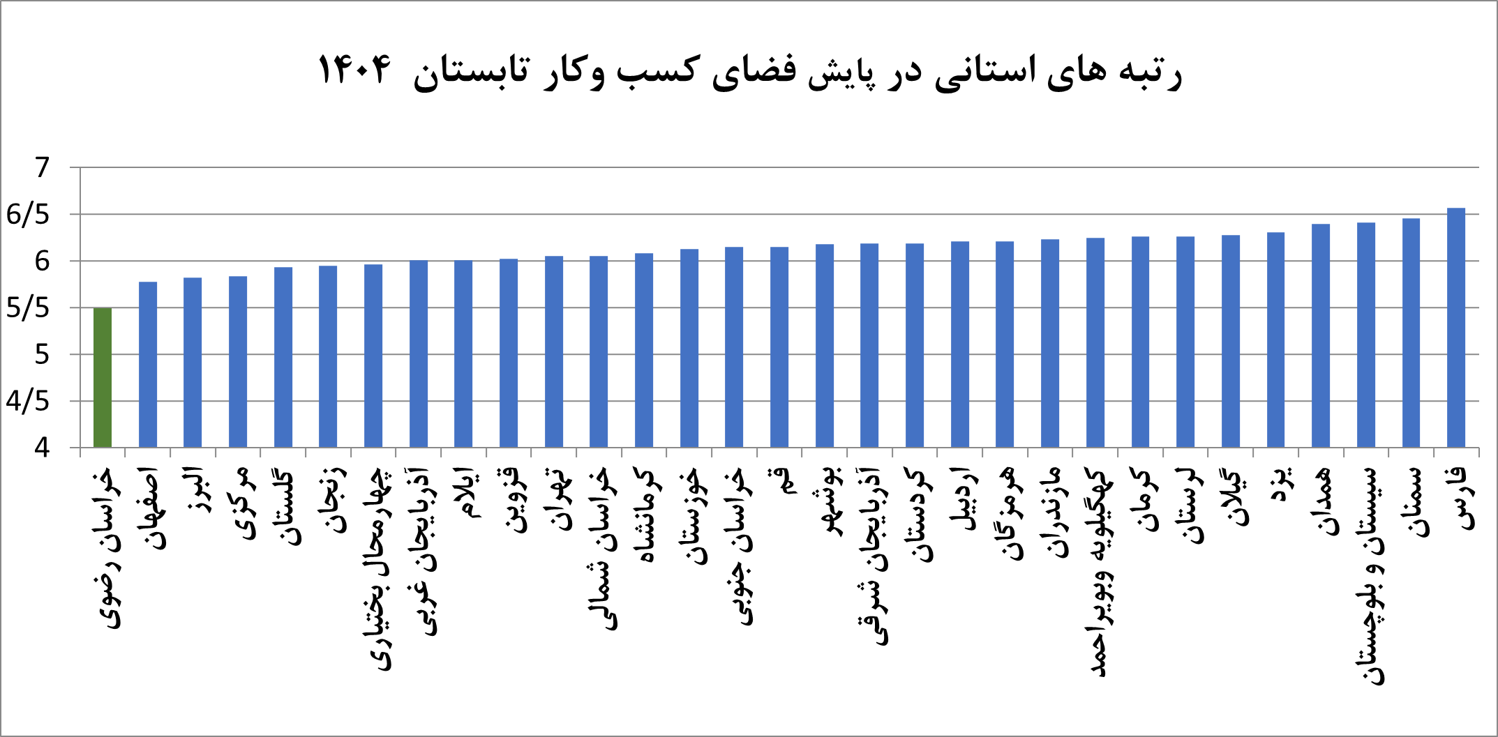 نتایج پایش ملی محیط کسب‌وکار در تابستان ۱۴۰۴ نشان می‌دهد که استان خراسان رضوی همچنان جایگاه نخست خود را در میان استان‌های کشور حفظ کرده است و پس از آن، استان‌های اصفهان و البرز در رده‌های بعدی قرار گرفته‌اند. این برتری در حالی رقم خورده که اختلاف شاخص وضعیت محیط کسب‌وکار میان بهترین و بدترین استان‌ها، کمتر از ۱.۱ واحد برآورد شده و بیانگر تفاوت اندک در وضعیت کلی فضای کسب‌وکار کشور است.