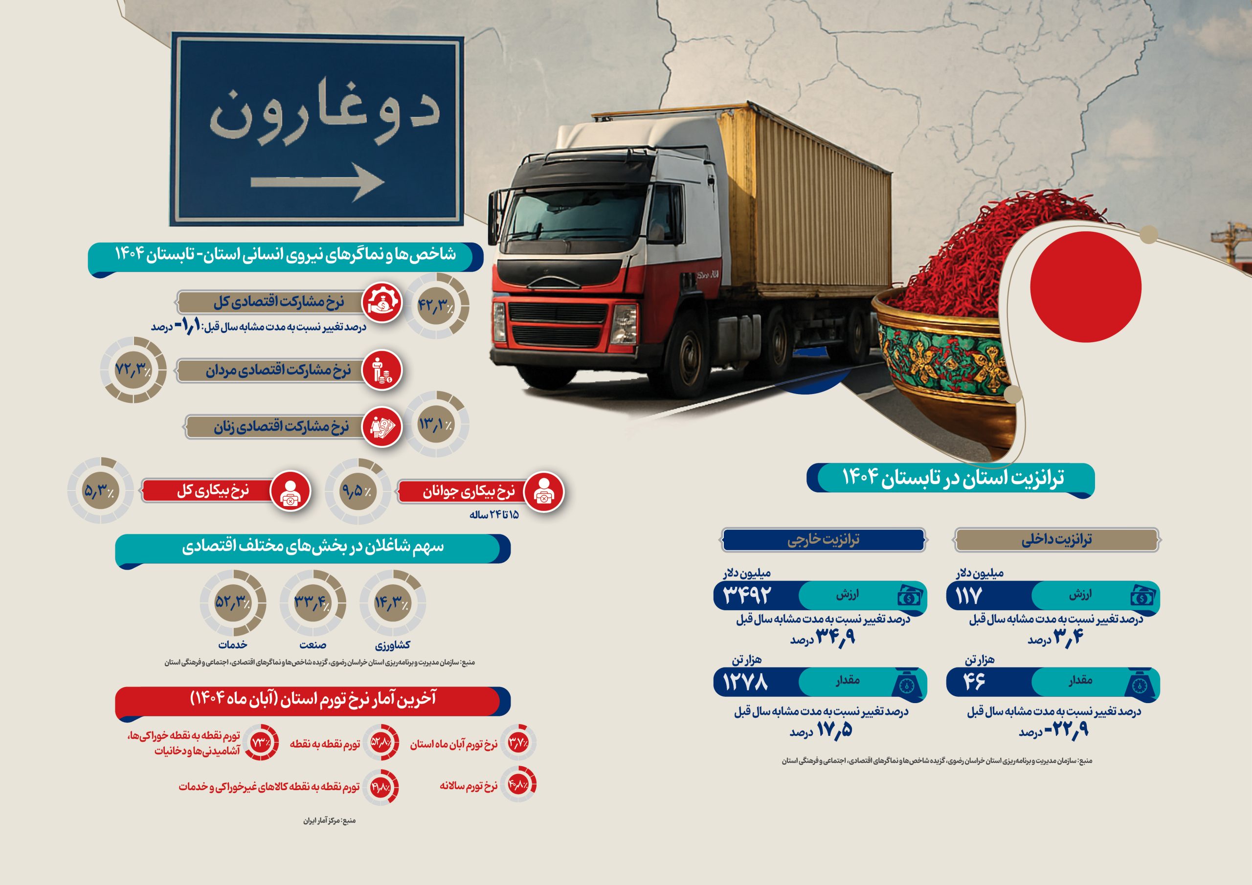آخرین آمارهای رسمی از شاخصهای منتخب اقتصادی خراسان رضوی در سال ۱۴۰۴ شامل وضعیت صادرات و واردات، تراز تجاری استان، عملکرد ترانزیت داخلی و خارجی، نماگرهای بازار کار و تحولات نرخ تورم، تصویری روشن از روندهای اقتصادی این خطه و جایگاه آن در اقتصاد کشور ارائه میدهد.