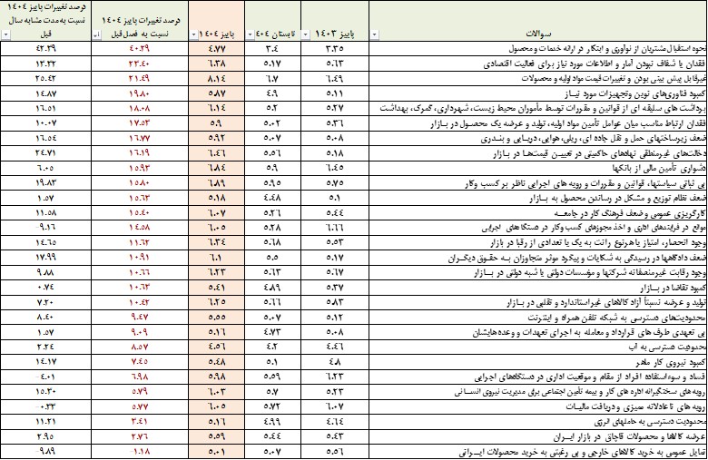 وی ادامه داد: بررسی تغییرات مؤلفه‌های جزئی در پاییز ۱۴۰۴ نسبت به فصل گذشته (تابستان) نشان می‌دهد که سه مؤلفه «فقدان یا شفاف نبودن آمار و اطلاعات مورد نیاز برای فعالیت اقتصادی»، «غیرقابل پیش‌بینی بودن و تغییرات قیمت مواد اولیه و محصولات» و «نحوه استقبال مشتریان از نوآوری و ابتکار در ارائه خدمات و محصولات» نامساعدترین وضعیت را تجربه کرده‌اند. در مقابل، مؤلفه‌های «تمایل عمومی به خرید کالاهای خارجی و بی رغبتی به خرید محصولات ایرانی»، «عرضه کالاها و محصولات قاچاق در بازار ایران» و «محدودیت دسترسی به حامل‌های انرژی»، بهبود نسبی را نشان می‌دهند.