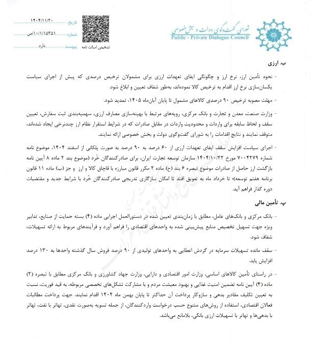 -وزارت امور اقتصادی و دارایی، وزارت جهاد کشاورزی و بانک مرکزی موظف شدند بدهیها و سازوکار پرداخت آن برای تأمین کالاهای اساسی را تا پایان بهمن 1404 تعیین تکلیف کنند.