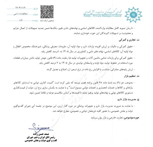 یکصد و سی و پنجمین نشست شورای گفتوگوی دولت و بخش خصوصی به ریاست وزیر امور اقتصادی و دارایی و با حضور اعضای نمایندگان قوای سهگانه و بخش خصوصی برگزار شد. در این جلسه، مصوبات مهمی در زمینه حمایت از تولید، تأمین ارز و تسهیلات مالی واحدهای اقتصادی تصویب شد.